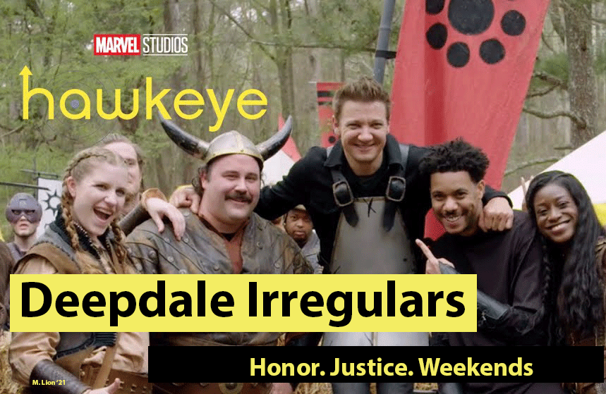 Now one of my favorite things in Hawkeye was his interaction with and then help from some LARPers. Wait, you might thing, LARPers? LARP stand for Live Action Role Play. Take Dungeons & Dragons, mix it with improve theater and you have LARP. (Why yes I do LARP and I love it.) The LARPers have a world they call Deepdale and play in this world with great enthusiasm.
